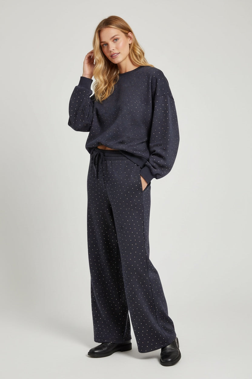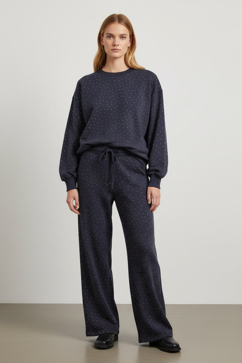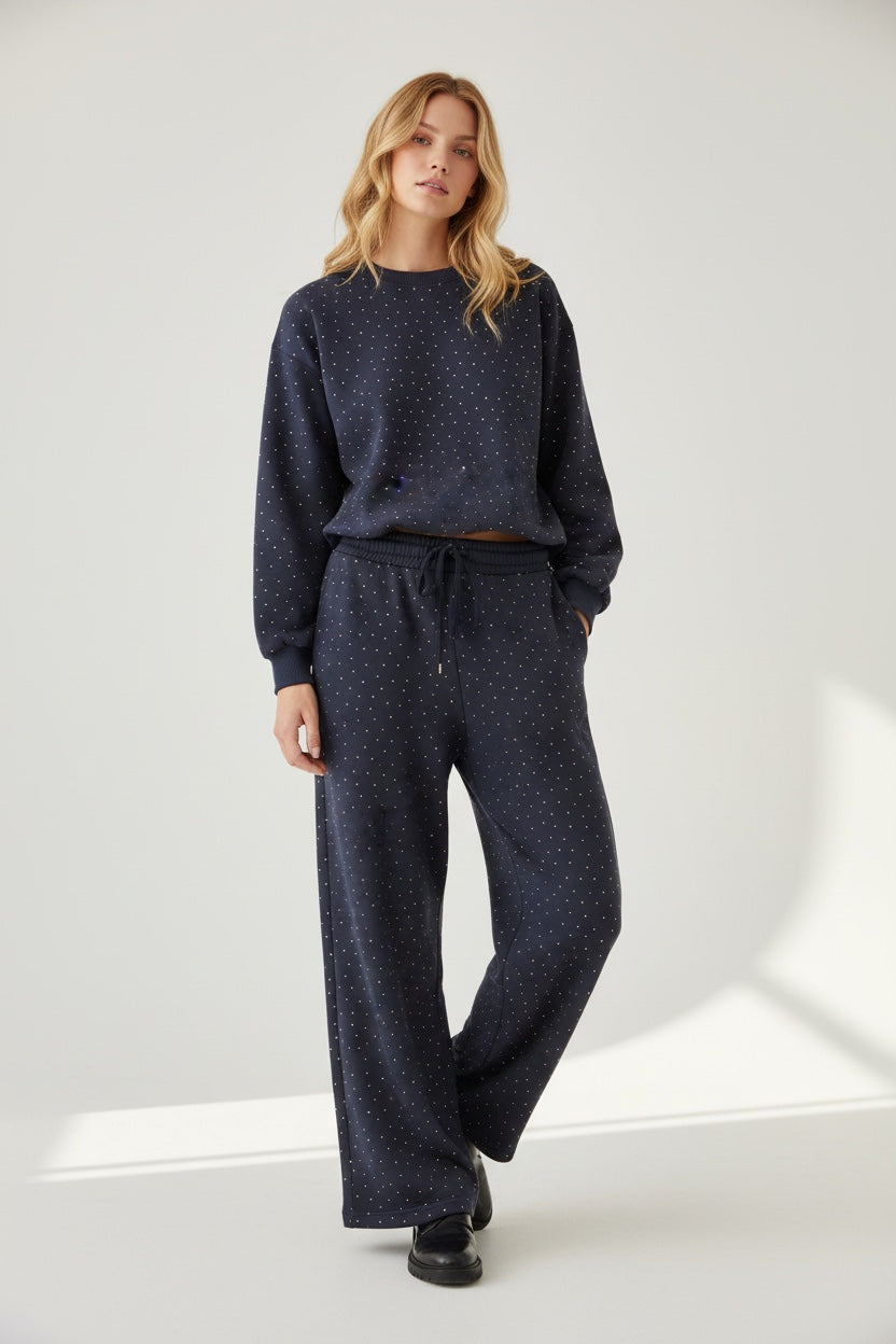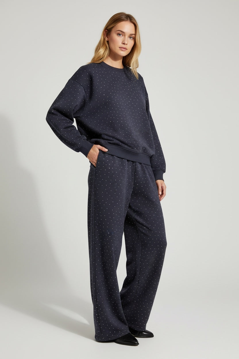 Taş Detaylı 3 İplik Bisiklet Yaka Sweat & Bol Paça Eşofman Takımı – Lacivert